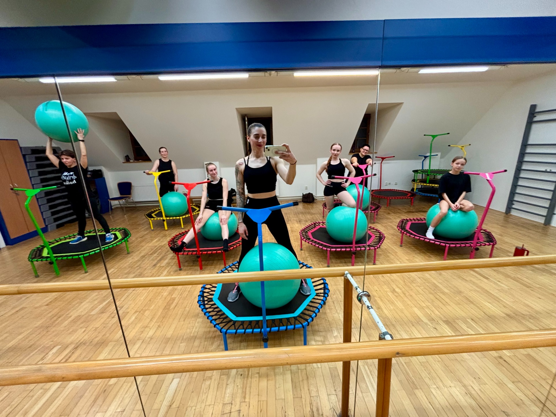 Tolik oblíbená černá barva naplnila taneční sál a všechny ženy si skvěle zaskákaly na trampolínkách. Ale nejen to, tentokrát byla lekce obohaceno o posilování celého těla. Na řadu přišly i gymnastické míče, které byly skvělým pomocníkem při posilování.